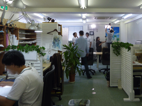 社員が通常の業務をする奥で撮影のセッティングが始まります。